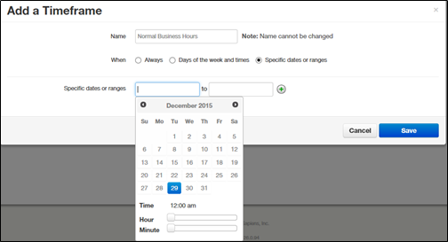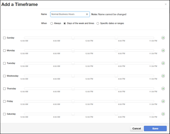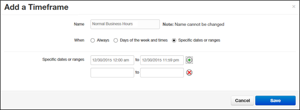 Always = select this option if the time frame will always be applied. Click Save to complete the procedure.Days of the week and times = select this option to select days and times when the time frame will be applied. Proceed to “If you select Days of the week and times” on page 22.Specific dates or ranges = select this option to specify a specific date or range of dates. Proceed to “If you select Specific dates or ranges” on page 26.